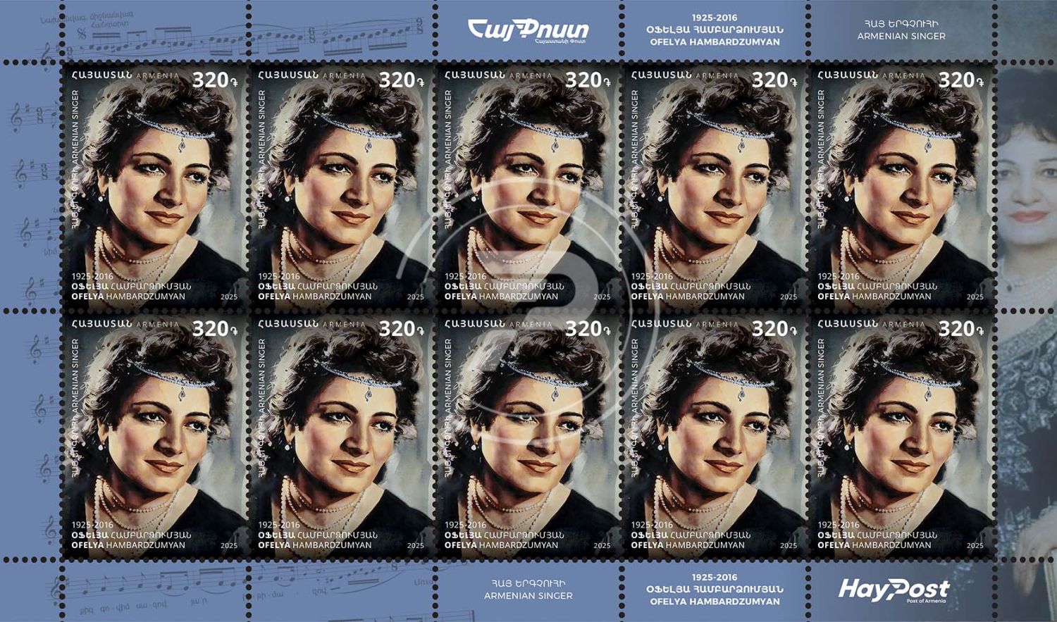 320 ՀՀ դրամ անվանական արժեքով նամականիշի վրա պատկերված է հայ մեծանուն երգչուհի, ՀԽՍՀ ժողովրդական արտիստ Օֆելյա Համբարձումյանը (1925-2016թթ.):