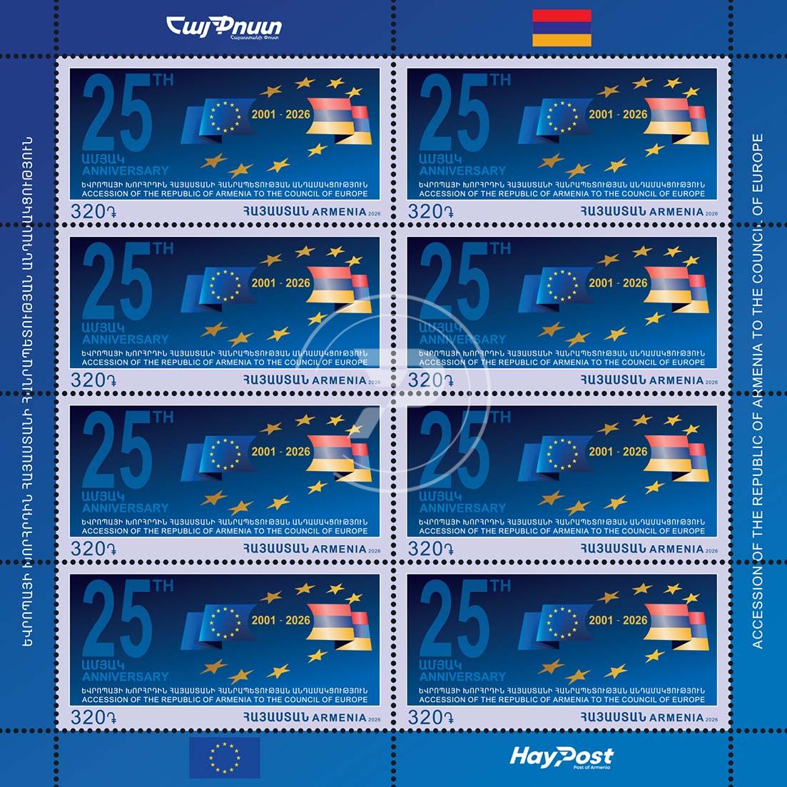 320 ՀՀ դրամ անվանական արժեքով նամականիշի վրա պատկերված են Հայաստանի Հանրապետության և Եվրոպայի խորհրդի ծածանվող դրոշները՝ Եվրոպայի խորհրդի աստղերի խորապատկերին: